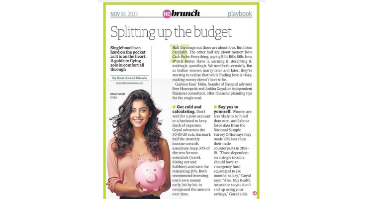 Gurleen Kaur Tikku featured in HT Brunch . Spoke about the importance of fi nancial planning for singles and how to approach it smartly and confi dently.